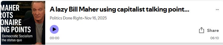 Bill Maher is using his platform to promote billionaires' Democratic Socialism fearing message because of Zohran Mamdani's effective deconstruction of a failed economic system in digestible form.
