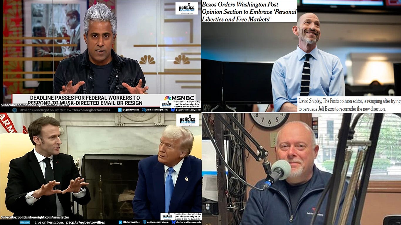 Dems slammed for timidity in these autocratic times. Macron calls out Trump's lie in real-time. Bezos turning WaPo into a propaganda rag. Neil Aquino visits.