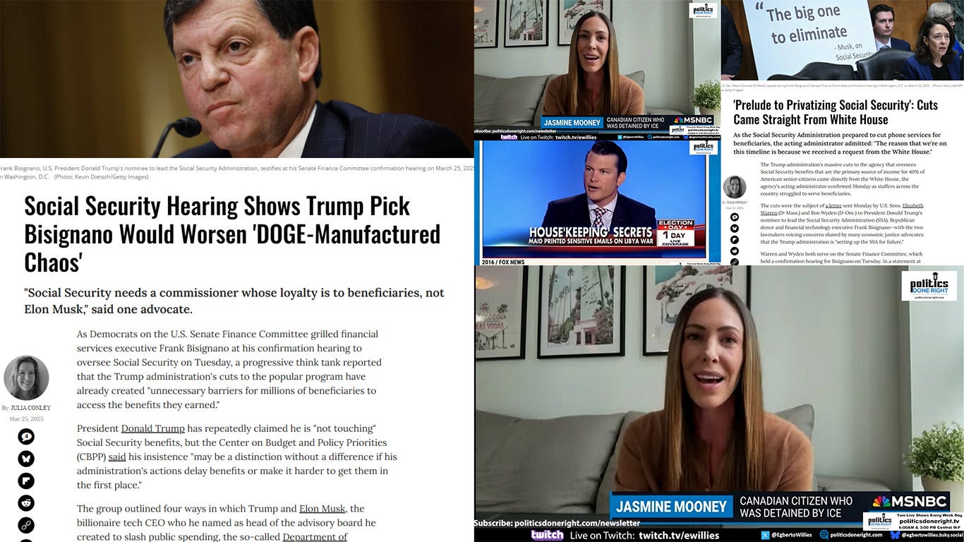 Social Security head enhances DOGE chaos. Canadian woman detained by ICE for 12 days detail the real Trump immigration fraud. Pete Hegseth on how to discipline himself.