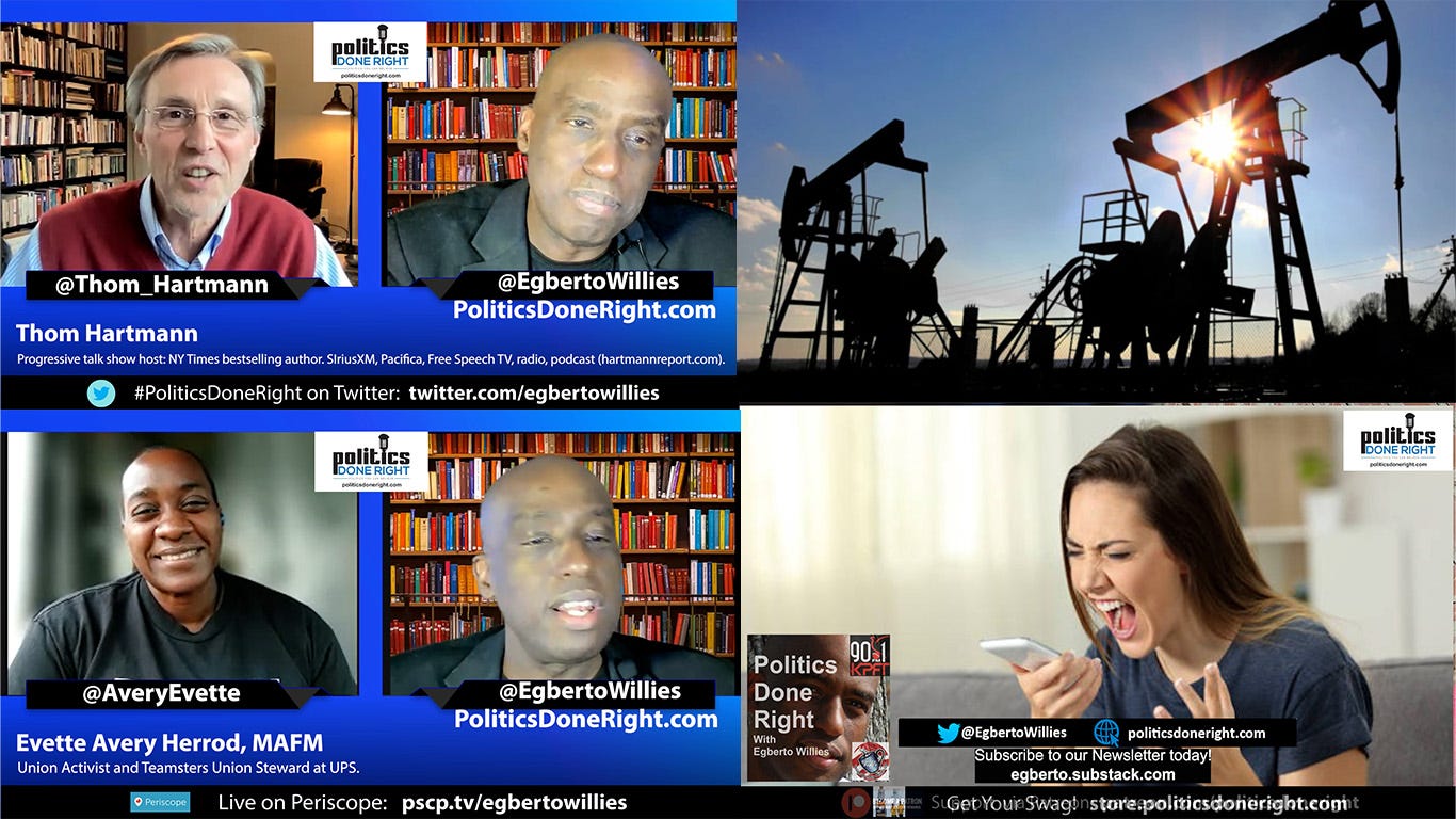 Thom Hartmann discusses The History of Big Brother in America. The gasoline fraud on Americans explained. Evette Avery Herrod discusses state of union movement. A civil exchange with a conservative.