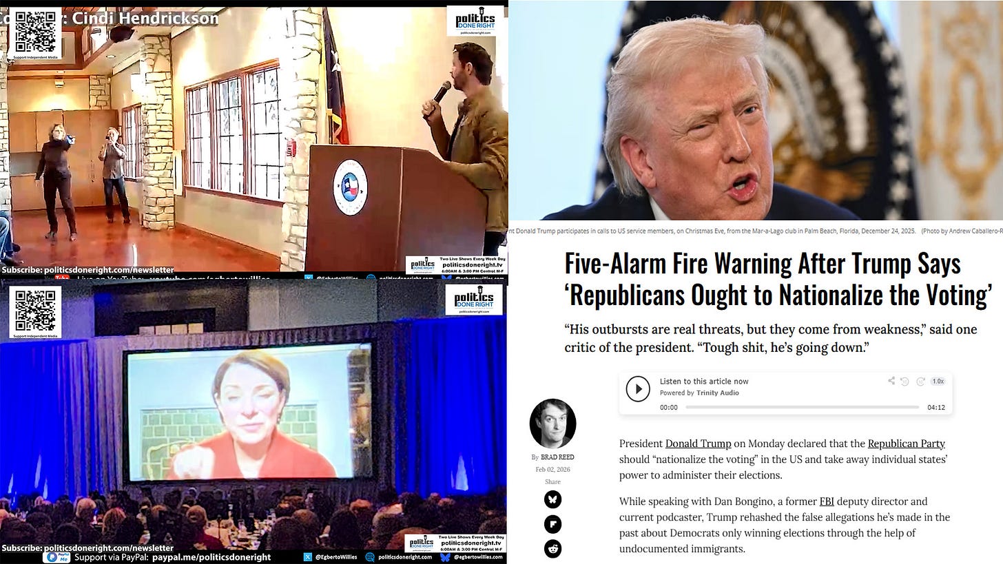 In this show: voters dismantle Crenshaw’s positions on immigration and foreign policy; Klobuchar connects federal overreach to a national awakening, and Trump’s call to “nationalize voting” triggers alarm bells about power consolidation.